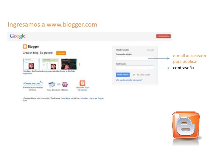 - 2. Ingresamos a www.blogger.com e-mail autorizado para publicar contraseña